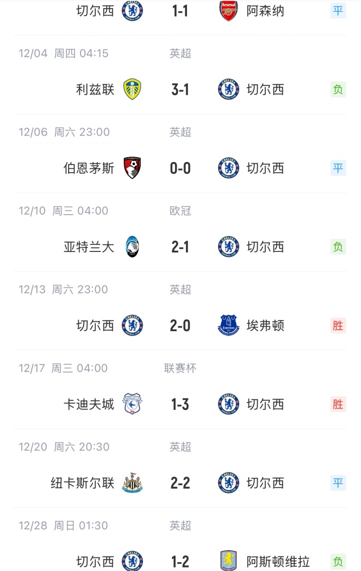 切尔西近期战绩: