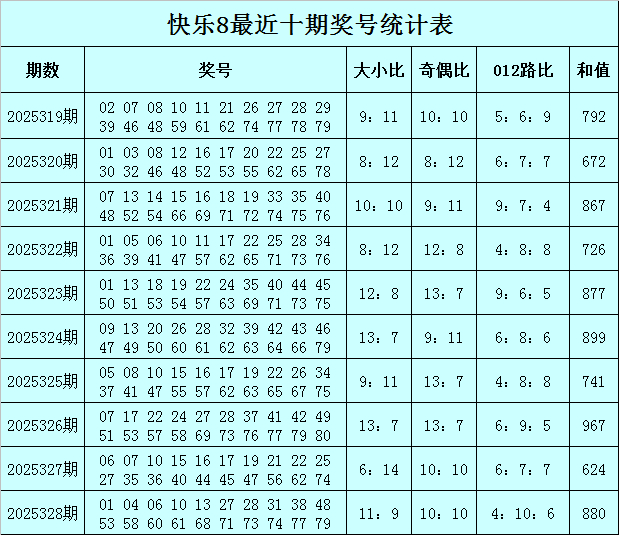 福彩安静8第2025328期开奖追想:01 04 06 10 13 27 28 31 38 48 53 58 60 61 68 71 73 74 77 79,其中奖号奇偶比开出10:10,大小比开出11:9,012路比开出4:10:6,和值为880,跨度为78。