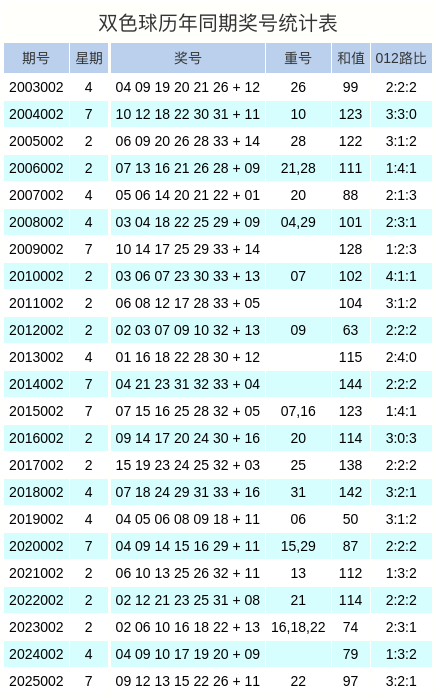 重号分析:在旧年同时奖号开出重号22,在历史同时中开出有重号的期数有18期,占比78.26%,本期预测开出重号02。