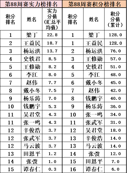 1月 3 日,乐弈场第 88 场围棋周赛于棋牌专家会馆如期启弈。一众围棋怜爱者怡然赴会,口角对弈于方寸棋枰,机灵交锋尽显棋谈魔力。数轮角逐之下,梁丁凭借深厚棋力、惨酷棋感与千里稳心性,沿途呼吁大进,将实力榜、积分榜双冠揽入怀中,实至名归!王益民相通大放异彩,他以凌厉又不失肃肃的棋风飞奔赛场,中盘缠斗时攻守兼备,收官阶段更是算路精确,凭借沿途高光主意与梁丁分享积分榜冠军荣耀,用实力讲授了弈者风仪。