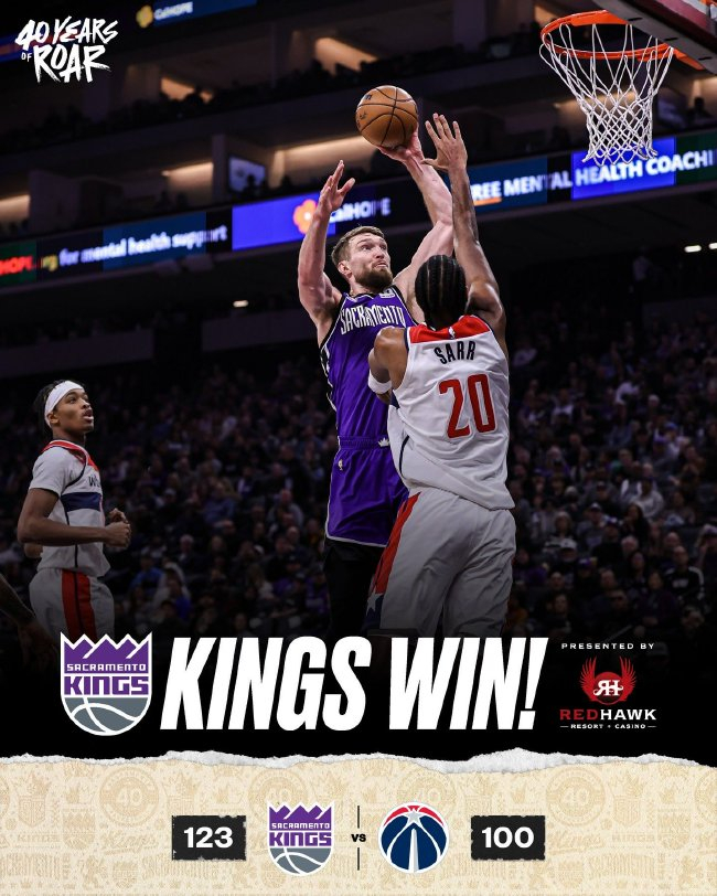 小萨16投12中高效砍下29分18篮板4助攻率队取胜,德罗赞24分6篮板,蒙克23分4助攻,国王两连胜西部第九。