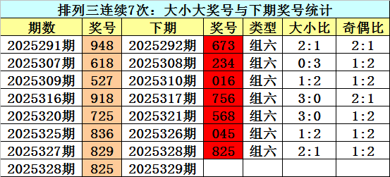 大小判断:上期罗列三奖号为825,大小为:大小大,近7次大小为大小大的奖号为:948-618-527-918-725-836-829。