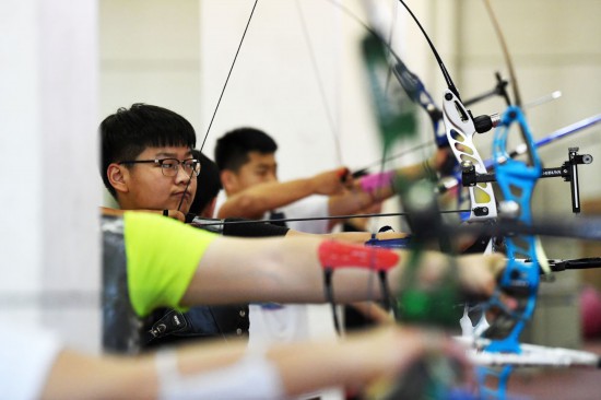 2020年6月3日,济南市体校学生李梦麒在进行射箭覆按。新华社记者 王凯 摄