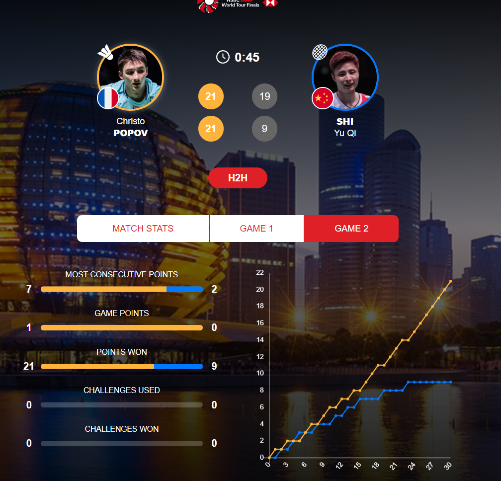 第二局开场1-1、2-2、3-3、4-4,小波波夫从6-4驱动掌控场面,石宇奇哀悼7-8后,小波波夫一波6-1径直14-8拉开到6分,随后9-14后石宇奇径直崩盘,小波波夫是一波7-0径直拿下胜仗,小波波夫21-9松弛拿下胜仗。
