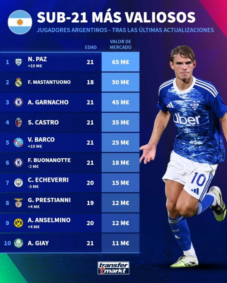 直播吧1月8日讯德国转会阛阓统计了阿根廷U21球员的身价,比肩出榜单,尼科·帕斯6500万欧居首,马斯坦托诺5000万欧次席。