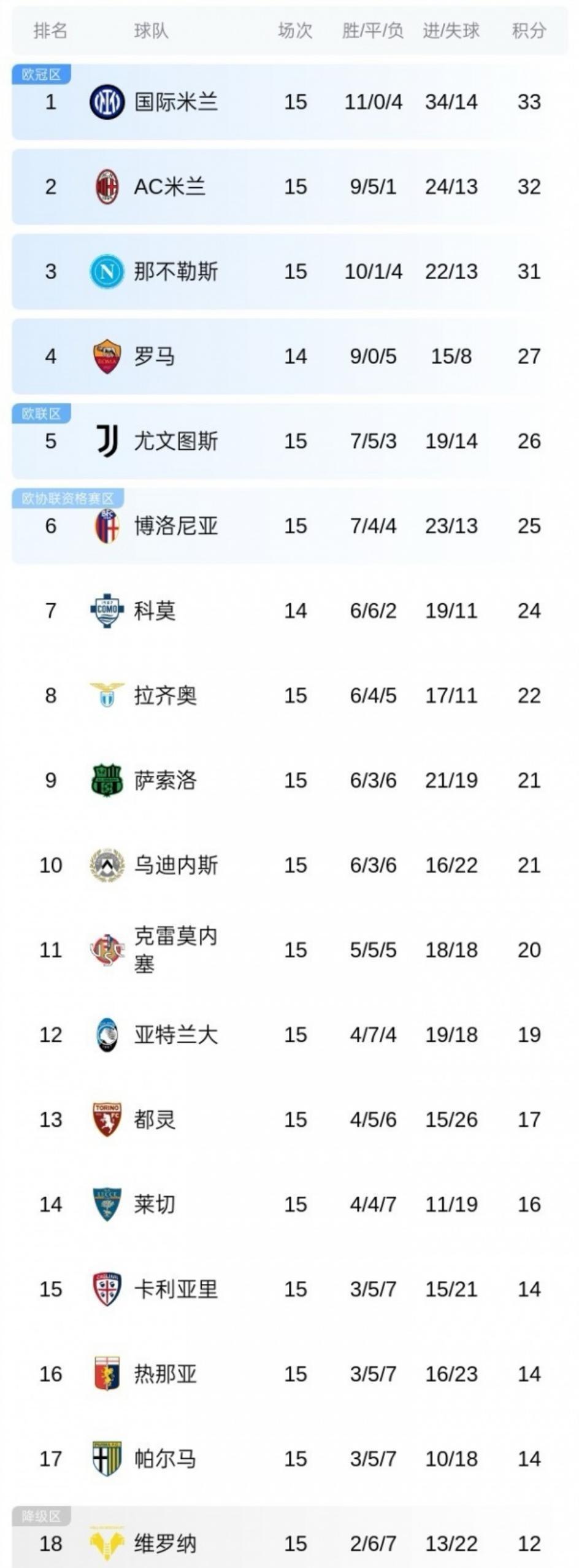 其他比赛亦然冷门频出。乌迪内斯1-0爆冷干掉那不勒斯,埃克伦坎普一脚天下波绝杀;维罗纳2-1读秒绝杀佛罗伦萨,奥尔班补时梅开二度。就连垫底的佛罗伦萨,当今才积6分,一胜难求,确实惨绝人寰。