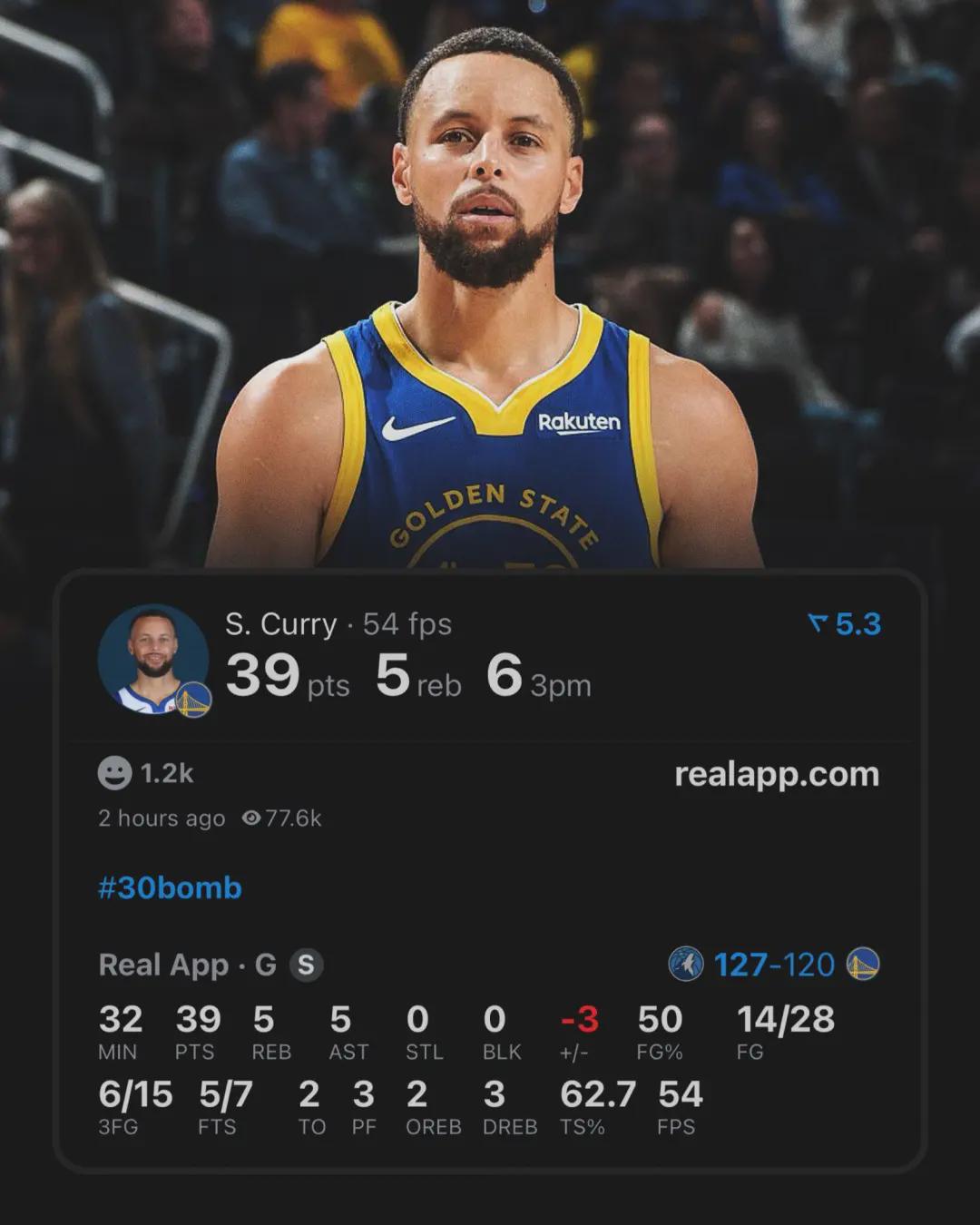 时隔五场比赛,库里再行披挂上阵,投篮28中14,其中三分15中6把持39分5板5助,可惜难救主,骁雄120-127不敌丛林狼,战绩来到13胜13负名次西部第八。