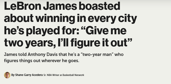 尽管在场世东说念主皆明晰他的夺冠资格,詹姆斯仍专门强调:我方在每座城市的“第二个赛季”皆能带队夺冠。他说:“给我两年手艺,我即是‘两年夺冠型’球员。迈阿密的第二个赛季——夺冠;回到克利夫兰的第二个赛季——夺冠;湖东说念主的第二个赛季——夺冠。给我两年,我就能处分一切。”