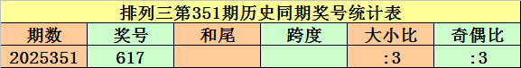 上期总结:胪列三第2025351期奖号开出617。