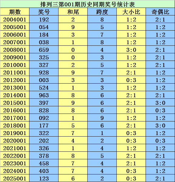 跨度分析:在胪列三第001期历史同时中,奖号跨度012路比为8:7:7,奇偶比为10:12,大小比为12:10,跨度出现期数为:跨度4、6→4期,跨度3、5→3期,跨度2、7、8→2期,跨度1、9→1期,跨度0→0期,本期瞻望开出0路跨度,精选跨度3。